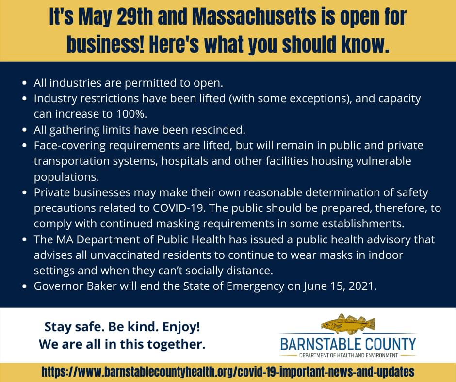 Barnstable County wants to ensure residents that a coordinated response is taking place in our region. We remain committed to encouraging all citizens to wear a mask, maintain a physical distance of at least 6 feet, and wash hands for at least 20 seconds. For more information, COVID-19 case counts, testing, and vaccine information visit http://www.barnstablecountyhealth.orgor http://www.mass.gov